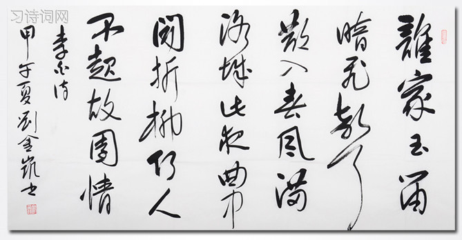 全诗扣紧一个“闻”字,抒写自己闻笛的感受。诗的第一句是猜测性的问句。那未曾露面的吹笛人只管自吹自听,却不期然而打动了许许多多听众,这就是句中“暗”字所包含的意味。第二句说笛声由春风吹散,传遍了洛阳城。这是诗人的想象,也是艺术的夸张。第三句说明春风传来的笛声,吹奏的是表现离情别绪的《折杨柳》,于是紧接一句说,哪个能不被引发思念故乡家园的情感呢!水到渠成而戛然而止,因而余韵袅袅,令人回味无穷。