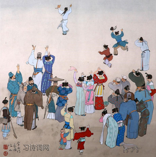 此诗是李白的醉歌,诗中以醉汉的心理和眼光看周围世界,实际上是以带有诗意的眼光来看待一切,思索一切。诗一开始用了晋朝山简的典故。山简镇守襄阳时,喜欢去习家花园喝酒,常常大醉骑马而回。当时的歌谣说他:“日暮倒载归,酩酊无所知。复能骑骏马,倒着白接篱。”接篱,一种白色帽子。李白在这里是说自己像当年的山简一样,日暮归来,烂醉如泥,被儿童拦住拍手唱歌,引起满街的喧笑。