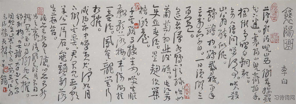 落日将没于岘山之西。我戴着山公的白帽子在花下饮得醉态可掬。襄阳的小儿一起拍着手在街上拦着我高唱《白铜鞮之歌》。路旁之人问他们所笑何事?他们原来是笑我像山公一样烂醉如泥。提起鸬鹚杓把酒添得满满的,高举起鹦鹉杯开怀畅饮。百年共有三万六干日,我要每天都畅饮它三百杯。遥看汉水像鸭头的颜色一样绿,好像是刚刚酿好还未曾滤过的绿葡萄酒。此江之水若能变为一江春酒,就在江边筑上一个舜山和酒糟台;学着历史上的曹彰,来一个骏马换妾的风流之举,笑坐在马上,口唱着《落梅花》;车旁再挂上一壶美酒,在一派凤笙龙管中出游行乐。那咸阳市中行将腰斩徒叹黄犬的李斯,何如我在月下自由自在地倾酒行乐?君不是见过在岘山上晋朝羊公的那块堕泪碑玛?驮碑的石龟头部剥落,长满了青苔。看了它我既不为之流泪,也不为之悲哀。这山间的清风朗月,不用花钱就可任意地享用,既然喝就喝个大醉倒,如玉山自己倾倒不是人推。端起那舒州杓,擎起那力士铛,李白要与你们同死生。楚襄王的云雨之梦哪里去了?在这静静的夜晚所能见到只有月下的江水,所听到的只有夜猿的悲啼之声。