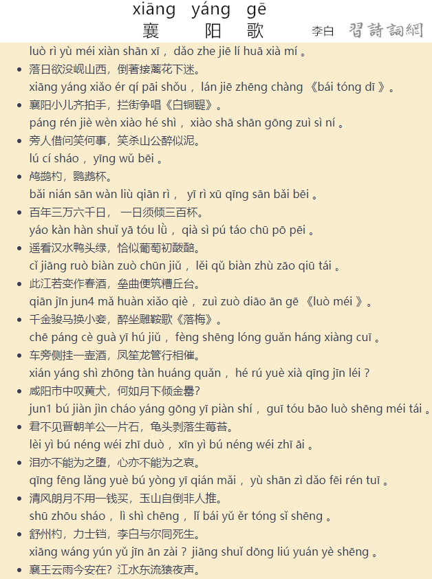 ⑴襄阳歌:为李白创辞,属杂歌谣辞。襄阳:唐县名,今属湖北。