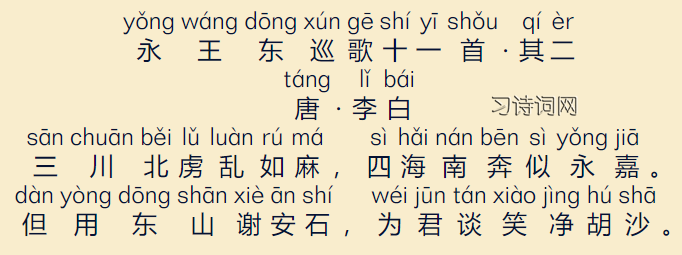 1、永王:唐玄宗第十六子,名李璘。《永王东巡歌》李白集中本十一首,元人萧士赟、近人郭沫若等认为原其九为伪作。
