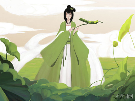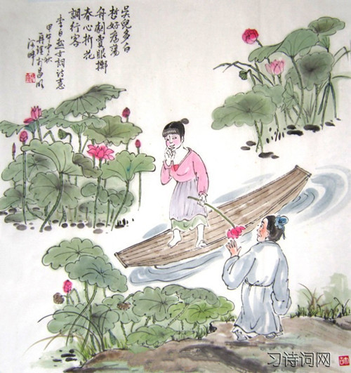 第三首诗所写则是另一种性格的劳动妇女。这位在若耶溪上采撷莲藕的女子与前一首诗中的吴儿大不相同,当她看见别的船上的客人时便唱着歌掉转船头,伴随着欢乐的歌声将小船划入荷花丛中,并假装怕羞似的不再出来。这位女子性格内向,虽然也怀有春心,却把这种情感深藏在内心,有点羞羞答答的。但其内心荡漾的春潮还是无法全部掩饰住的,诗人早已窥破其内心的隐秘,否则难以写出“佯羞不出来”的诗句。“佯羞”二字极精彩,将少女欲看青年男子又羞涩不好意思的心理与情态刻画得惟妙惟肖。透过这两个字,仿佛可以看到在密密层层的荷花丛中,那位采莲的姑娘正从荷花荷叶的缝隙中偷偷地窥视着客人。鲜艳的花朵与美人的脸庞相互映衬,这和谐美妙的景象真令人魂梦心醉。于此可以看出,这首小诗虽很浅白,但蕴味却很隽永。