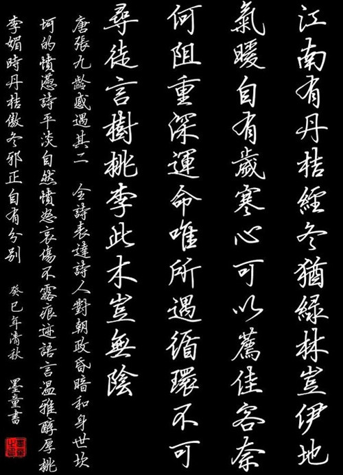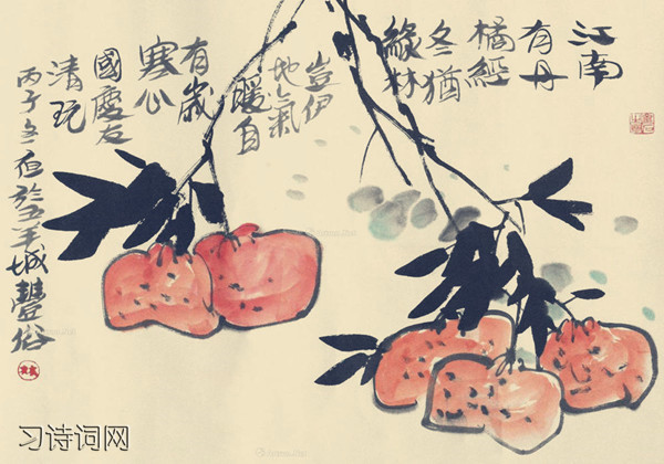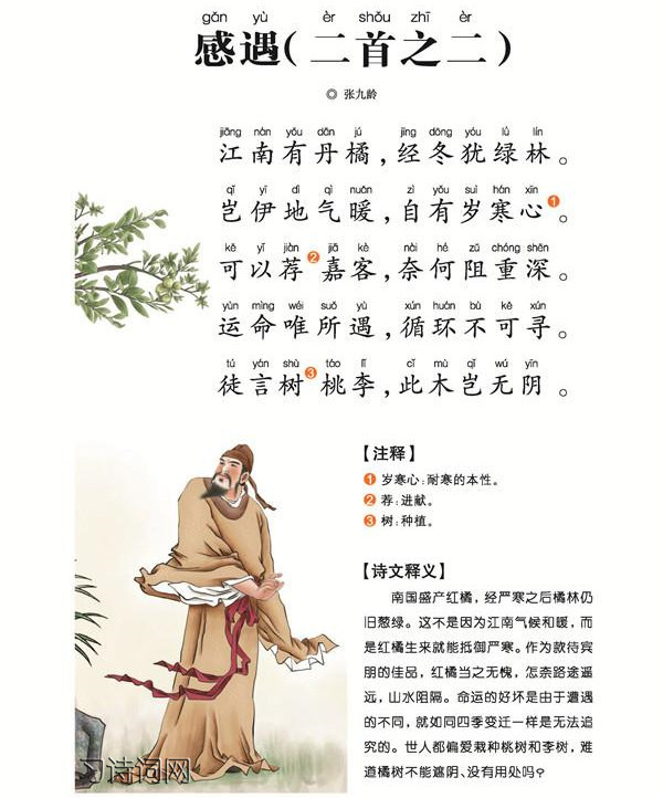读着张九龄这首歌颂丹橘的诗,很容易想到屈原的《橘颂》。屈原生于南国,橘树也生于南国,他的那篇《橘颂》一开头就说:“后皇嘉树,橘徕服兮。受命不迁,生南国兮。”其托物喻志之意,灼然可见。张九龄也是南方人,而他的谪居地荆州的治所江陵(即楚国的郢都),本来是著名的产橘区。他的这首诗一开头就说:“江南有丹橘,经冬犹绿林”,其托物喻志之意,尤其明显。屈原的名句告诉我们:“袅袅兮秋风,洞庭波兮木叶下。”可见即使在南国,一到深秋,一般树木也难免摇落,又哪能经得住严冬的摧残?而丹橘呢,却“经冬犹绿林”。一个“犹”字,充满了赞颂之意。