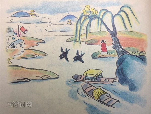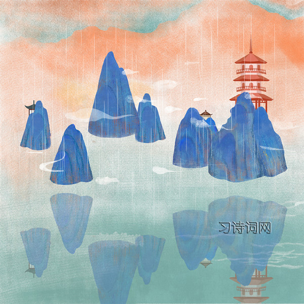 “千里莺啼绿映红,水村山郭酒旗风。”诗一开头,就像迅速移动的电影镜头,掠过南国大地:辽阔的千里江南,黄莺在欢乐地歌唱,丛丛绿树映着簇簇红花;傍水的村庄、依山的城郭、迎风招展的酒旗,一一在望。迷人的江南,经过诗人生花妙笔的点染,显得更加令人心旌摇荡了。摇荡的原因,除了景物的繁丽外,恐怕还由于这种繁丽,不同于某处园林名胜,仅仅局限于一个角落,而是由于这种繁丽是铺展在大块土地上的。因此,开头如果没有“千里”二字,这两句就要减色了。但是,明代杨慎在《升庵诗话》中说:“千里莺啼,谁人听得?千里绿映红,谁人见得?若作十里,则莺啼绿红之景,村郭、楼台、僧寺、酒旗,皆在其中矣。”对于这种意见,何文焕在《历代诗话考索》中曾驳斥道:“即作十里,亦未必尽听得着,看得见。题云《江南春》,江南方广千里,千里之中,莺啼而绿映焉,水村山郭无处无酒旗,四百八十寺楼台多在烟雨中也。此诗之意既广,不得专指一处,故总而命曰《江南春》……”何文焕的说法是对的,这是出于文学艺术典型概括的需要。同样的道理也适用于后两句。“南朝四百八十寺,多少楼台烟雨中。”从前两句看,莺鸟啼鸣,红绿相映,酒旗招展,应该是晴天的景象,但这两句明明写到烟雨,只是因为千里范围内,各处阴晴不同。不过,还需要看到的是,诗人运用了典型化的手法,把握住了江南景物的特征。江南特点是山重水复,柳暗花明,色调错综,层次丰富而有立体感。诗人在缩千里于尺幅的同时,着重表现了江南春天掩映相衬、丰富多彩的美丽景色。诗的前两句,有红绿色彩的映衬,有山水的映衬,村庄和城郭的映衬,有动静的映衬,有声色的映衬。但光是这些,似乎还不够丰富,还只描绘出江南春景明朗的一面。所以诗人又加上精彩的一笔:“南朝四百八十寺,多少楼台烟雨中。”金碧辉煌、屋宇重重的佛寺,本来就给人一种深邃的感觉,现在诗人又特意让它出没掩映于迷蒙的烟雨之中,这就更增加了一种朦胧迷离的色彩。这样的画面和色调,与“千里莺啼绿映红,水村山郭酒旗风”的明朗绚丽相映,就使得这幅“江南春”的图画变得更加丰富多彩。“南朝”二字更给这幅画面增添悠远的历史色彩。“四百八十”是唐人强调数量之多的一种说法。诗人先强调建筑宏丽的佛寺非止一处,然后再接以“多少楼台烟雨中”这样的唱叹,就特别引人遐想。