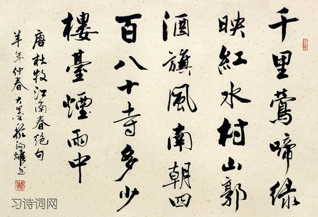 杜牧特别擅长于在寥寥四句二十八字中,描绘一幅幅绚丽动人的图画,呈现一种深邃幽美的意境,表达一缕缕含蓄深蕴的情思,给人以美的享受和思的启迪。《江南春》反映了中国诗歌与绘画中的审美是超越时空的、淡泊洒脱的、有着儒释道与禅宗“顿悟”的思想,而它们所表现的多为思旧怀远、归隐、写意的诗情。