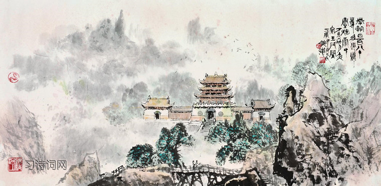 南朝遗留下的四百八十多座古寺,无数的楼台全笼罩在风烟云雨中。