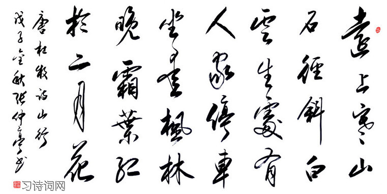 “远上寒山石径斜”,写山,写山路。一条弯弯曲曲的小路蜿蜓伸向山头。“远”字写出了山路的绵长,“斜”字与“上”字呼应,写出了高而缓的山势。这样写,从题意来说,写出了“行”的特点,而从构图来说,却借勾画山路逶迤绵远之特点山势幽深平缓的形体特点,同时自然地把人们的视线沿着山路引向白云生处的人家。