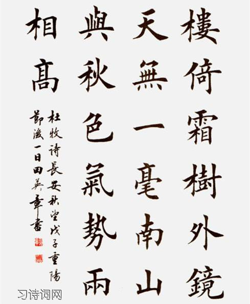 这首诗的好处,还在于它在写出长安高秋景色的同时写出了诗人的精神性格。它更接近于写意画。高远、寥廓、明净的秋色,实际上也正是诗人胸怀的象征与外化。特别是诗的末句,赋予南山与秋色一种峻拔向上的动态,这就更鲜明地表现出了诗人的性格气质,也使全诗在跃动的气势中结束,留下了充分的想象余地。
