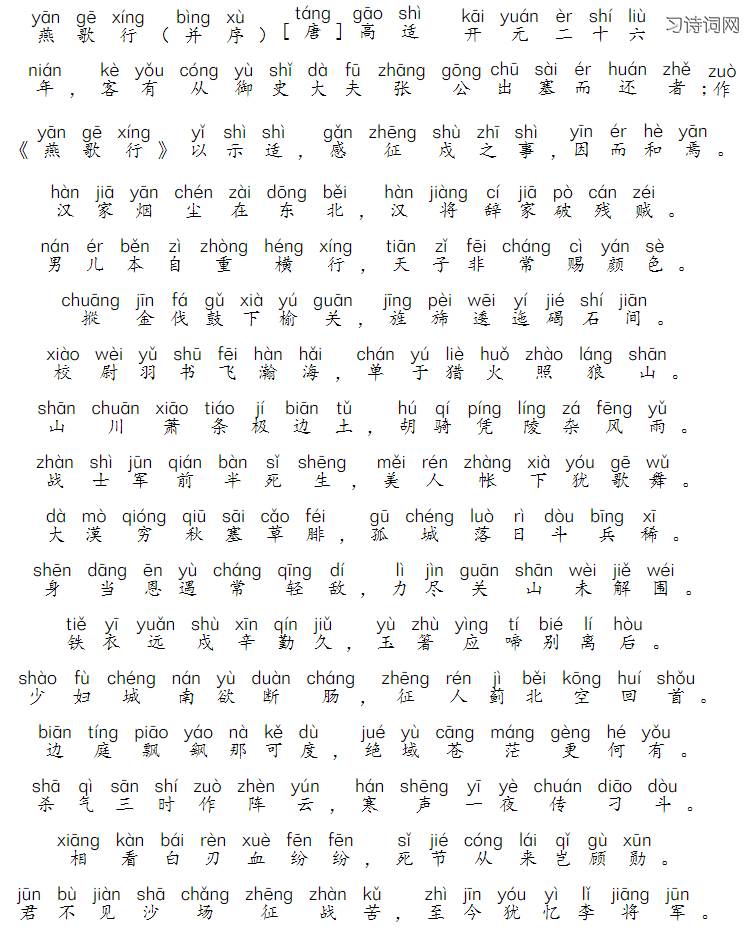 《燕歌行》是高适的代表作,不仅是高适的“第一大篇”(近人赵熙评语),而且是整个唐代边塞诗中的杰作,千古传诵,良非偶然。