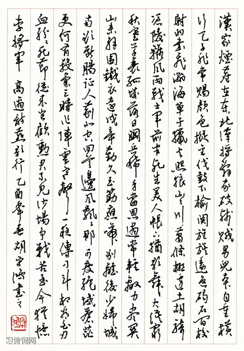 诗人的感情包含着悲悯和礼赞,而“岂顾勋”则是有力地讥刺了轻开边衅,冒进贪功的汉将。最末二句,诗人深为感慨道:“君不见沙场征战苦,至今犹忆李将军!”八九百年前威镇北边的飞将军李广,处处爱护士卒,使士卒“咸乐为之死”。这与那些骄横的将军形成多么鲜明的对比。诗人提出李将军,意义尤为深广。从汉到唐,悠悠千载,边塞战争何计其数,驱士兵如鸡犬的将帅数不胜数,备历艰苦而埋尸异域的士兵,更何止千千万万!可是,千百年来只有一个李广,不能不教人苦苦地追念他。杜甫赞美高适、岑参的诗:“意惬关飞动,篇终接混茫。”(《寄高使君岑长史三十韵》)此诗以李广终篇,意境更为雄浑而深远。