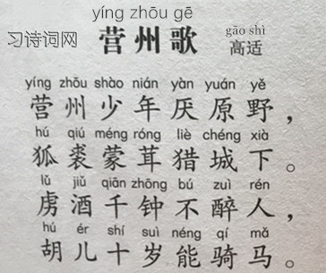 作品简介《营州歌》是唐代诗人高适的七言绝句。此诗描写边塞地区尚武风气,形象生动地刻画了北方少数民族青少年的形象,表现了他们的生活风貌和豪放的性格,赞扬了他们豪迈勇武的精神。此诗体现了胡汉民族之间精神文化的摩荡和融合,透露出刚健、雄浑的民族气息,在唐代边塞诗中是稀有的。