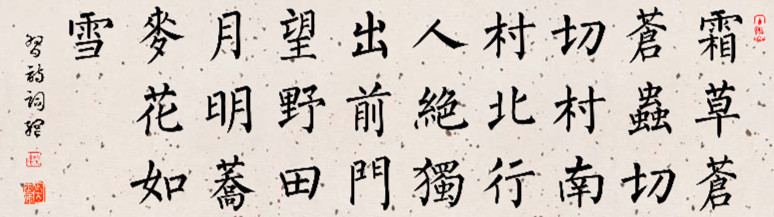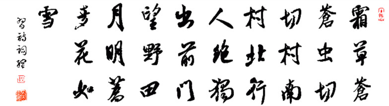“霜草苍苍虫切切,村南村北行人绝”,苍苍霜草,点出秋色的浓重;切切虫吟,渲染了秋夜的凄清。行人绝迹,万籁无声,两句诗鲜明勾画出村夜的特征:夜色深沉,秋色浓重,在秋霜的浸染下,草色茫茫。四下里一片寂静,行人绝迹。只有不知名的秋虫在低低的吟唱。