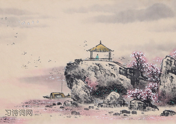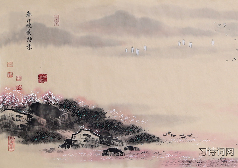 江畔林木茂盛,花儿盛开;天上云朵落日相辉映,景象明丽。征行逢此佳景,惊喜之情顿生。自觉春思渺然,赏心自得,其中佳趣,莫可言传。日落西山,整个江面沐浴在夕阳的余晖中,水面泛着金光。飘落的花瓣伴着晚霞洒落在渡口的客船上,这样一幅绮丽迷人的景象,怎不让人赞叹。