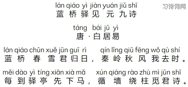 元稹题在驿亭的那首诗说:“千层玉帐铺松盖,五出银区印虎蹄。”“玉帐”、“银区”说明他经过这里时正逢春雪,所以白居易的诗一开头就说:“蓝桥春雪君归日”。元稹西归长安,事在初春,小桃初放;白居易东去江州,时为八月,满目秋风,因此,第二句接上“秦岭秋风我去时”。白居易被贬江州,自长安经商州这一段,与元稹西归的道路是一致的。在蓝桥驿既然看到元稹的诗,后此沿途驿亭很多,还可能留有元稹的题咏,所以三、四句接着说:“每到驿亭先下马,循墙绕柱觅君诗。”