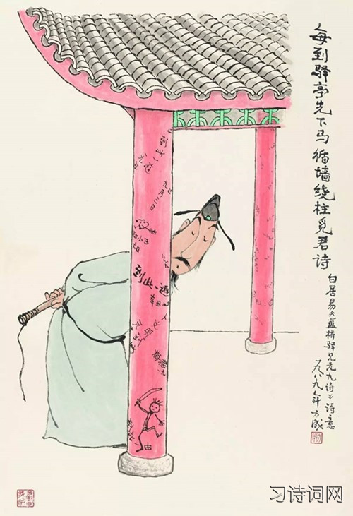 每到达一个驿站我都要首先下马,沿墙绕柱东看西樵寻找你的题诗。