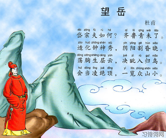 作品简介《望岳》是唐代诗人杜甫创作的五言古诗。这首诗通过描绘泰山雄伟磅礴的景象,热情赞美了泰山高大巍峨的气势和神奇秀丽的景色,流露出了对祖国山河的热爱之情,表达了诗人不怕困难、敢攀顶峰、俯视一切的雄心和气概,以及卓然独立、兼济天下的豪情壮志。
