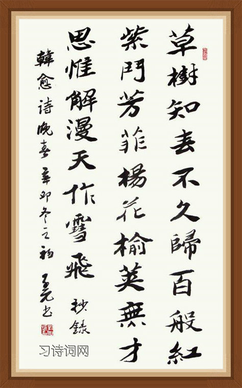 此诗题一作“游城南晚春”,可知所写乃春游郊外所见。仅就描写暮春景色而言,此诗可谓有情有趣,亦不落俗套。诗人全用拟人手法,糅人与花于一体,不说人之惜春,而说草树亦知春将不久,因而百花争艳,各呈芳菲。凑热闹的还有朴素无华的杨花榆荚,像飞雪一般漫天遍野地飘舞。人言草木无情,诗偏说它们有知,能“知”能“解”还能“斗”,而且还有“才思”高下有无之分。想象之奇,实为诗中所罕见。这是此诗明白有趣之处,堪称平中翻新,颇富奇趣。