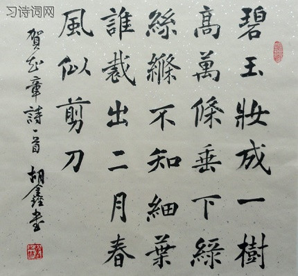 作品简介《咏柳》是盛唐诗人贺知章写的一首七言绝句。这首诗是一首咏物诗。诗的前两句连用两个新美的喻象,描绘春柳的勃勃生气,葱翠袅娜;后两句更别出心裁地把春风比喻为“剪刀”,将视之无形不可捉摸的“春风”形象地表现出来,不仅立意新奇,而且饱含韵味。