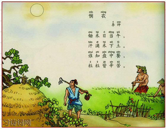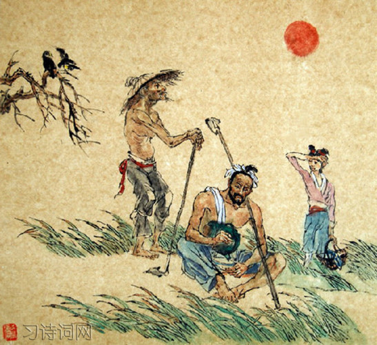 徐增《而庵说唐诗》:种禾偏在极热之天,赤日呆呆,当正午之际,锄者在田里做活,真要热杀人……及至转成四糙,煮饭堆盘,白如象齿,尽意大嚼,那知所餐之米,一粒一粒,皆农人肋骨上汗雨中锄出来者也!公垂作此诗,宜乎克昌其后。此题“悯”字,自必点出,若说得透彻,则“悯”字在其中矣。