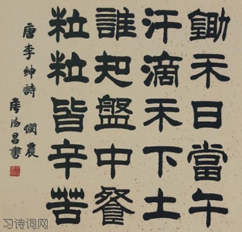 第二首诗,一开头就描绘在烈日当空的正午,农民依然在田里劳作,那一滴滴的汗珠,洒在灼热的土地上。这就补叙出由“一粒粟”到“万颗子”,到“四海无闲田”,乃是千千万万个农民用血汗浇灌起来的;这也为下面“粒粒皆辛苦”撷取了最富有典型意义的形象,可谓一以当十。它概括地表现了农民不避严寒酷暑、雨雪风霜,终年辛勤劳动的生活。“谁知盘中餐,粒粒皆辛苦”,不是空洞的说教,不是无病的呻吟;它近似蕴意深远的格言,但又不仅以它的说服力取胜,而且还由于在这一深沉的慨叹之中,凝聚了诗人无限的愤懑和真挚的同情。