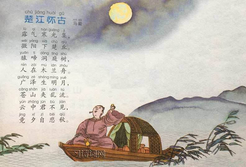秋风遥落的薄暮时分,江上晚雾初生,楚山夕阳西下,露气迷茫,寒意侵人。这种萧瑟清冷的秋暮景象,深曲微婉地透露了诗人悲凉落寞的情怀。斯时斯地,入耳的是洞庭湖边树丛中猿猴的哀啼,照眼的是江上飘流的木兰舟。“袅袅兮秋风,洞庭波兮木叶下”(《楚辞·九歌·湘夫人》),“船容与而不进兮,淹回水而凝滞”(《涉江》),诗人泛游在湘江之上,对景怀人,屈原的歌声仿佛在叩击他的心弦。“猿啼洞庭树,人在木兰舟”,这是晚唐诗中的名句,一句写听觉,一句写视觉;一句写物,一句写己;上句静中有动,下句动中有静。诗人伤秋怀远之情并没有直接说明,只是点染了一张淡彩的画,气象清远,婉而不露,让人思而得之。黄昏已尽,夜幕降临,一轮明月从广阔的洞庭湖上升起,深苍的山峦间夹泻着汩汩而下的乱流。“广泽生明月,苍山夹乱流”二句,描绘的虽是比较广阔的景象,但它的情致与笔墨还是清微婉约的。同是用五律写明月,张九龄的“海上生明月,天涯共此时”(《望月怀远》),李白的“梦绕城边月,心飞故国楼”(《太原早秋》),杜甫的“星垂平野阔,月涌大江流”(《旅夜书怀》),都是所谓“高华雄厚”之作。而马戴此联的风调却有明显的不同,这一联承上发展而来,是山水分设的写景。但“一切景语,皆情语也”(田同之《西圃词说》),“广泽生明月”的阔大和静谧,曲曲反衬出诗人远谪遐方的孤单离索;“苍山夹乱流”的迷茫与纷扰,深深映照出诗人内心深处的撩乱彷徨。夜已深沉,诗人尚未归去,俯仰于天地之间,沉浮于湘波之上,他不禁想起楚地古老的传说和屈原《九歌》中的“云中君”。“屈宋魂冥寞,江山思寂寥”(《楚江怀古三首》之三),云神无由得见,屈子也邈矣难寻,诗人自然更是感慨丛生了。“云中君不见,竟夕自悲秋”,点明题目中的“怀古”,而且以“竟夕”与“悲秋”在时间和节候上呼应开篇,使全诗在变化错综之中呈现出和谐完整之美,让人寻绎不尽。