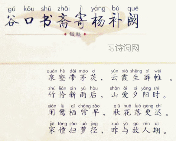 作品简介《谷口书斋寄杨补阙》是唐代诗人钱起创作的一首五言律诗。这是一首邀请朋友赴约的诗,诗的前三联全是绘景,着力描墓山居的景物美,隐含诱惑对方快来赏玩之意,末句写家僮扫径以侍,盼友人来临的心情殷切,并点明邀约之意。这首诗的最大特点是将水、云、竹、山、鹭、花人格化,写得极富感情。这首诗语言清丽,情真意切,风格清新奇淡,艺术感染力较强。