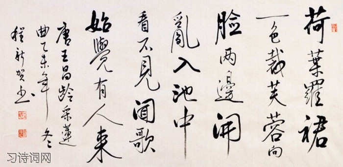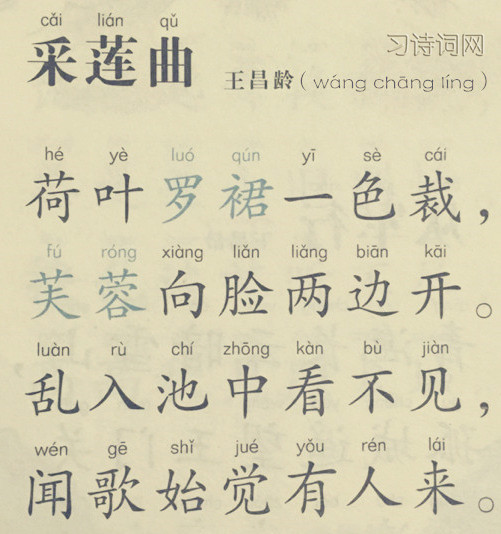 一开头就巧妙地把采莲少女和周围的自然环境组成一个和谐统一的整体──“荷叶罗裙一色裁,芙蓉向脸两边开。”说女子的罗裙绿得象荷叶一样,不过是个普通的比喻;而这里写的是采莲少女,置身莲池,说荷叶与罗裙一色,那便是“本地风光”,是“赋”而不是“比”了,显得生动喜人,兼有素朴和美艳的风致。次句的芙蓉即荷花。说少女的脸庞红润艳丽如同出水的荷花,这样的比喻也不算新鲜。但“芙蓉向脸两边开”却又不单是比喻,而是描绘出一幅美丽的图景:采莲少女的脸庞正掩映在盛开的荷花中间,看上去好象鲜艳的荷花正朝着少女的脸庞开放。把这两句联成一体,读者仿佛看到,在那一片绿荷红莲丛中,采莲少女的绿罗裙已经融入田田荷叶之中,几乎分不清孰为荷叶,孰为罗裙;而少女的脸庞则与鲜艳的荷花相互照映,人花难辨。让人感到,这些采莲女子简直就是美丽的大自然的一部分,或者说竟是荷花的精灵。这描写既具有真切的生活实感,又带有浓郁的童话色彩。