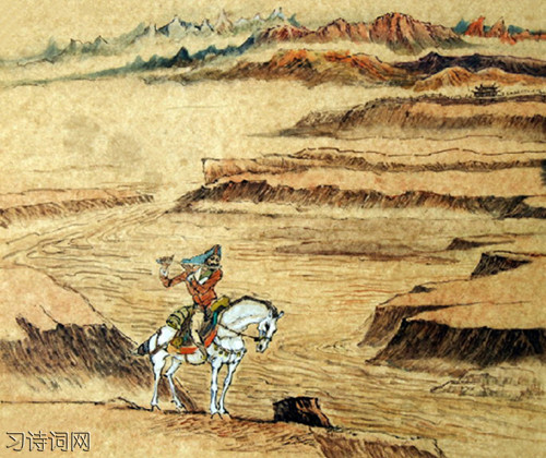 诗起于写山川的雄阔苍凉,承以戌守者处境的孤危。第三句忽而一转,引入羌笛之声。羌笛所奏乃《折杨柳》曲调,这就不能不勾起征夫的离愁了。此句系化用乐府《横吹曲辞·折杨柳歌辞》“上马不捉鞭,反折杨柳枝。蹀座吹长笛,愁杀行客儿”的诗意。折柳赠别的风习在唐时最盛。“杨柳”与离别有更直接的关系。所以,人们不但见了杨柳会引起别愁,连听到《折杨柳》的笛曲也会触动离恨。而“羌笛”句不说“闻折柳”却说“怨杨柳”,造语尤妙。这就避免直接用曲调名,化板为活,且能引发更多的联想,深化诗意。玉门关外,春风不度,杨柳不青,离人想要折一枝杨柳寄情也不能,这就比折柳送别更为难堪。征人怀着这种心情听曲,似乎笛声也在“怨杨柳”,流露的怨情是强烈的,而以“何须怨”的宽解语委婉出之,深沉含蓄,耐人寻味。这第三句以问语转出了如此浓郁的诗意,末句“春风不度玉门关”也就水到渠成。用“玉门关”一语入诗也与征人离思有关。《后汉书·班超传》云:“不敢望到酒泉郡,但愿生入玉门关。”所以末句正写边地苦寒,含蓄着无限的乡思离情。如果把这首《凉州词》与中唐以后的某些边塞诗(如张乔《河湟旧卒》)加以比较,就会发现,此诗虽极写戌边者不得还乡的怨情,但写得悲壮苍凉,没有衰飒颓唐的情调,表现出盛唐诗人广阔的心胸。即使写悲切的怨情,也是悲中有壮,悲凉而慷慨。“何须怨”三字不仅见其艺术手法的委婉蕴藉,也可看到当时边防将士在乡愁难禁时,也意识到卫国戌边责任的重大,方能如此自我宽解。也许正因为《凉州词》情调悲而不失其壮,所以能成为“唐音”的典型代表。