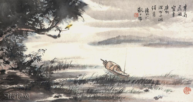 接下来两句侧重写荒津野渡之景。景物虽异,但仍然循此情愫作展衍:“春潮带雨晚来急,野渡无人舟自横”。这两句是说:到傍晚时分,春潮上涨,春雨淅沥,西涧水势顿见湍急。郊野渡口,本来就荒凉冷漠,此刻愈发难觅人踪。只有空舟随波纵横。“春潮”与“雨”之间用“带”字,好像雨是随着潮水而来,把本不相属的两种事物紧紧连在了一起,而且用一“急”字写出了潮和雨的动态。结尾句。用“无人”一说明渡口的‘“野”。二句诗所描绘的情境,未免有些荒凉,但用一“自”字,却体现着悠闲和自得。韦应物为诗好用“自”字,“自”字皆可释为“自在”“自然”之意,含有“自我欣赏”、“自我怜爱”的意蕴。“野渡”句当作如是解。舍此,便与一二句相悖谬了。这两句以飞转流动之势,衬托闲淡宁静之景,可谓诗中有画,景中寓情。
