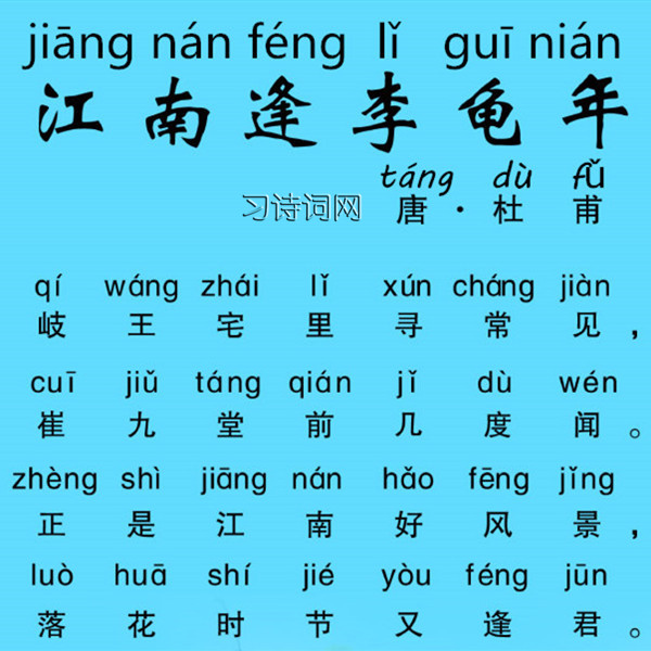 ⑴江南:此谓江、湘之间,今湖南省一带。李龟年:唐朝开元、天宝年间的著名乐师,擅长唱歌。因为受到皇帝唐玄宗的宠幸而红极一时,常在贵族豪门歌唱。“安史之乱”后,李龟年流落江南,卖艺为生。