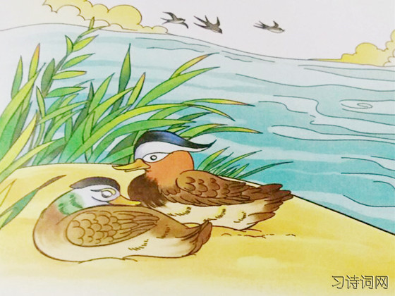 燕子衔着湿泥忙筑巢,暖和的沙子上睡着成双成对的鸳鸯。