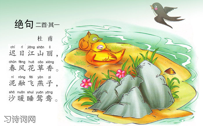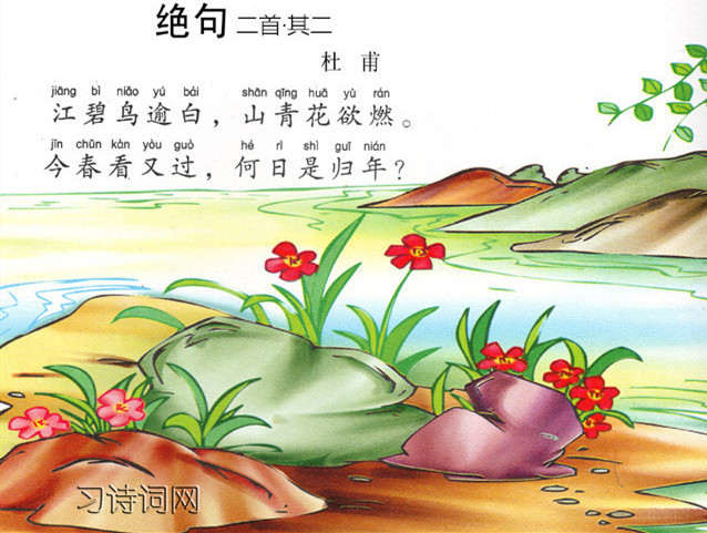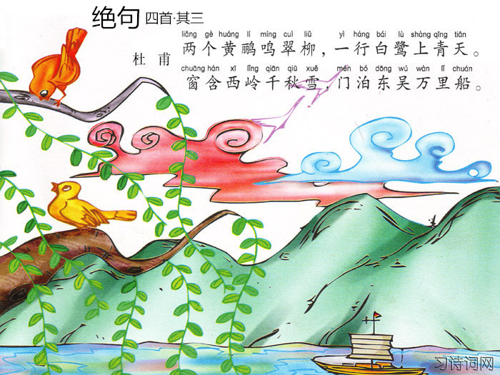 参考资料:绝句二首·其一《绝句·迟日江山丽》 绝句二首·其二《绝句·江碧鸟逾白》 绝句四首·其三《绝句·两个黄鹂鸣翠柳》
