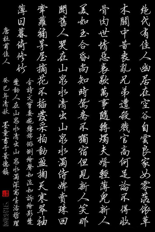 作品简介《佳人》是唐代大诗人杜甫的作品。这首诗写一个乱世佳人被丈夫遗弃,幽居空谷,艰难度日的不幸遭遇。她出身良家,然而生不逢 时,在安史战乱中,原来官居高位的兄弟惨遭杀戮,丈夫见她娘家败落,就遗弃了她,于是她在社会上流落无依。然而,她没有被不幸压倒没有向命运屈服;她咽下生活的苦水,幽居空谷,与草木为邻,立志守节,宛若山泉。此诗讴歌的就是这种贫贱不移,贞节自守的精神。全诗文笔委婉,缠绵悱恻,绘声如泣如诉,绘影楚楚动人。“在山泉水清,出山泉水浊”二句深寓生活哲理。