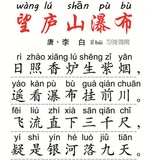 仿佛三千尺水流飞奔直冲而下,莫非是银河从九天垂落山崖间。